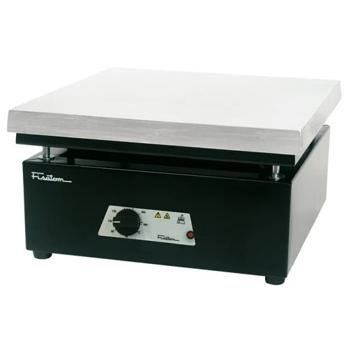 Placa aquecedora quadrilátera em alumínio inquebrável injetado com resistência blindada incorporada, possibilitando uma temperatura uniforme por toda a extensão da placa, temperatura da placa controlada por termostato capilar, lâmpada piloto, construída externamente em alumínio com acabamento em epóxi, possui cabo trifilar com fio terra em borracha atendendo a norma IEC.