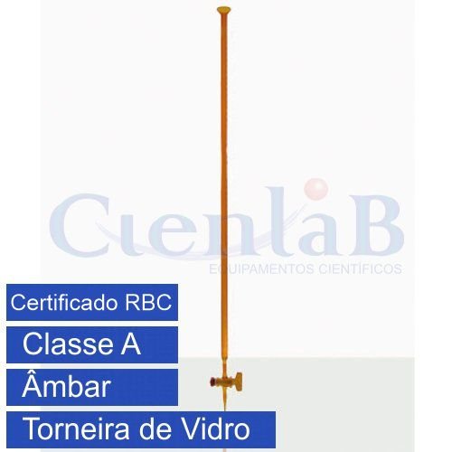 Bureta Graduada Divisão 1/10 com Torneira de Vidro Âmbar CLASSE A com Certificado de Calibração em 3 Pontos RBC - Capacidade 50ml