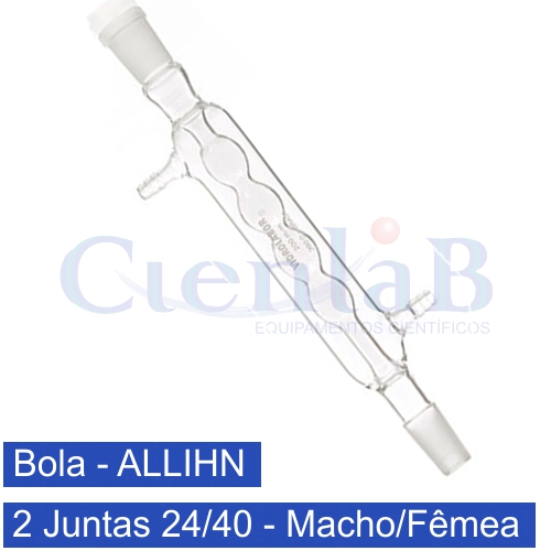 Condensador de Allihn tipo bola com 2 juntas 24/40 macho e fêmea, tamanho 500 mm