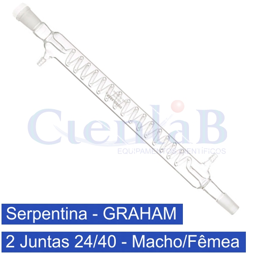 Condensador de Graham tipo Serpentina com 2 juntas 24/40 macho e fêmea, tamanho 300 mm
